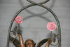 A top antique set from FranceSpelter bronze putti with majolica pink porcelain floral rosesgood condition with minimal wear90...