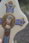 antique onyx marble crucifix holy water font plaquewith enamel inlay decorporcelain medaillon with hand paint christ portrait23.5 x15...