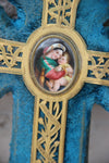 antique french holy water fontwith a metal gold gild crucifix and centrally a porcelain medaillon plaque with madonna...