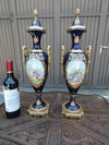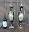 Vintage pair 1970s sevres style cobalt blue porcelain vases urns With victorian decors and landscape decors back bronze...