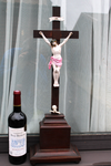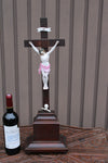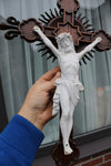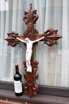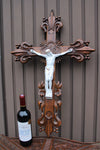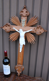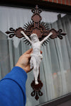 Antique XL wood carved church crucifix with porcelain corpus christ with fleur de lys , symbol of france80,5...