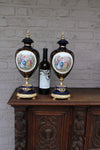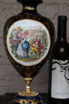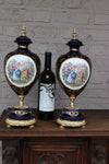 pair vintage 1970 cobalt blue porcelain vaseswith romantic decorslidded 40,5 cm height each good condition