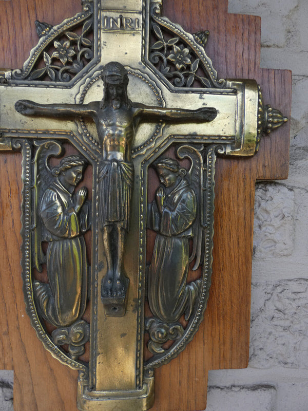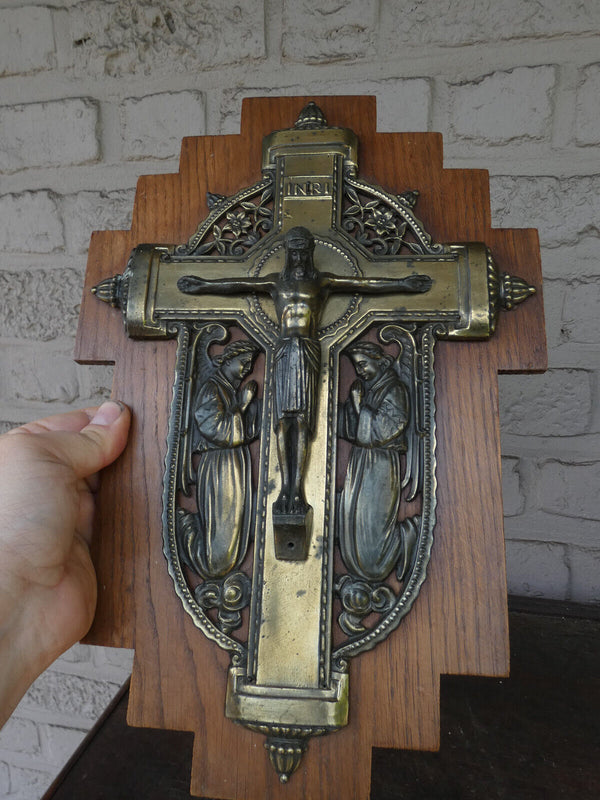 Antique Religious brass on wood wall plaque crucifix angels rare