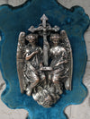 antique French holy water font plaqueon blue velvetzamac metal angels ( zamac is a bit softer metal alloy...