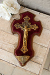 Gorgeous antique french crucifix with holy water fontbrass on red velvet and wood back plate25.5 cm height x...