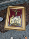 antique french religious wall plaquewith metal crucifix calvary scene behind glass framed , frame has some wear 45,5...
