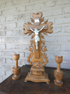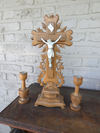 antique wood carved crucifix setwith matching side candlestickscrucifix 40 cm height and side pieces 15 cm heightchip hand...
