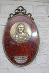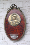 antique french religious wall plaque with holy water font with metal sacred heart christ medaillon ,signed by artist...