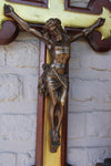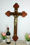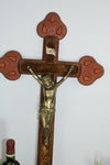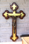Antique french XL heavy bronze & wood back plate Wall crucifixvery nice quality bronze corpus, fleur de lys,...