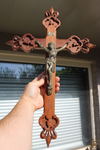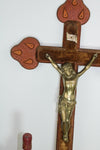 Antique rare to find french crucifixmetal and wood enamel decoration 51 x33 cmsome pins on the outside rim...