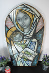 rare vintage french religious wood panel for wall hangingwith paint madonna with child in stained glass look very...