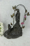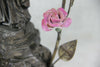 Antique LOURDES music box spelter metal with a bow over them with pink porcelain flowers music box inside...