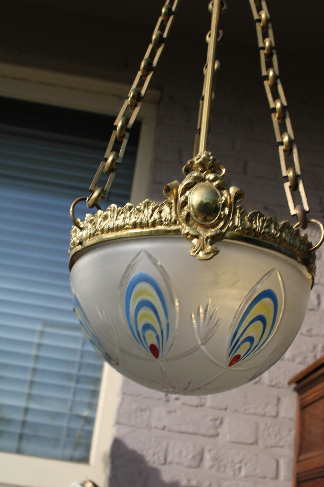Antique belgian crystal glass bowl enamel coloured pendant lamp chandelier