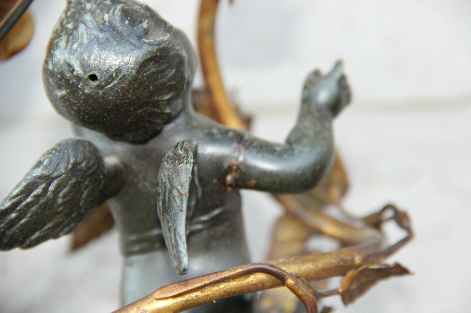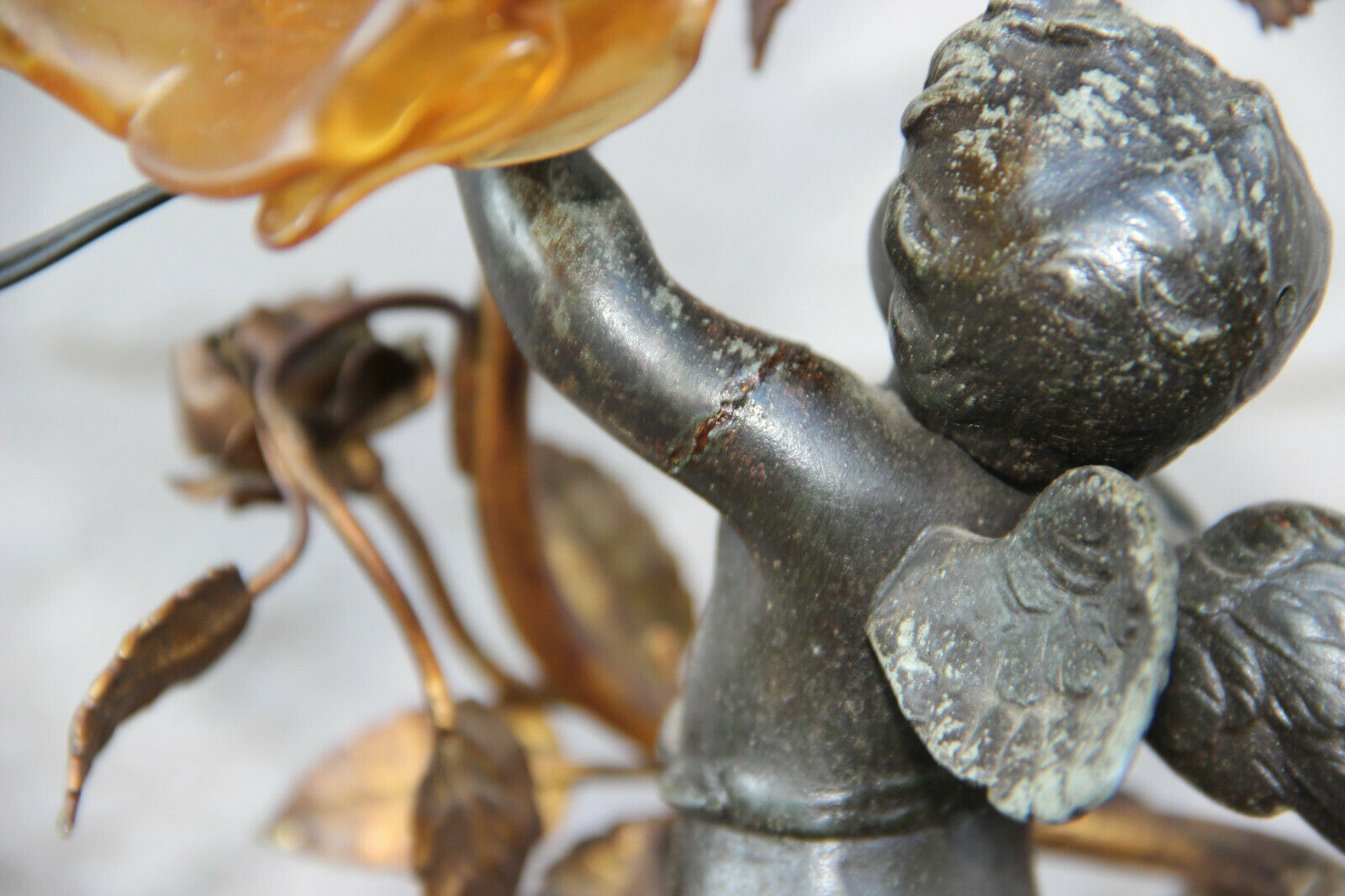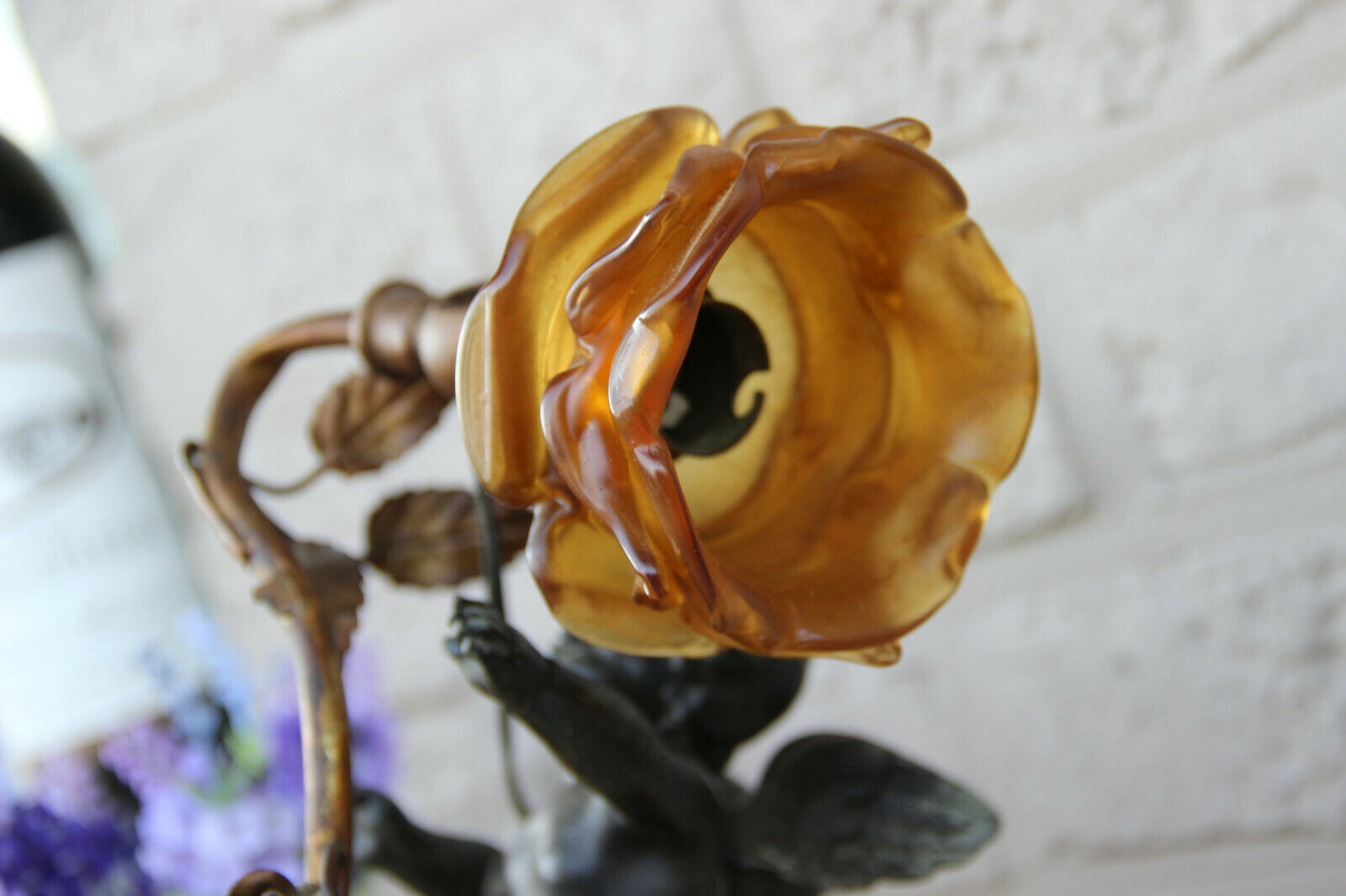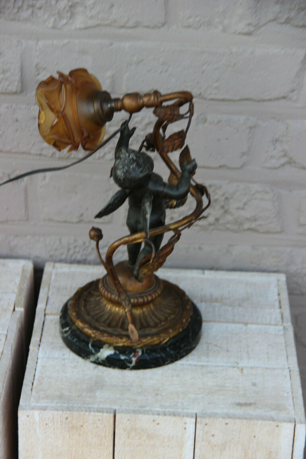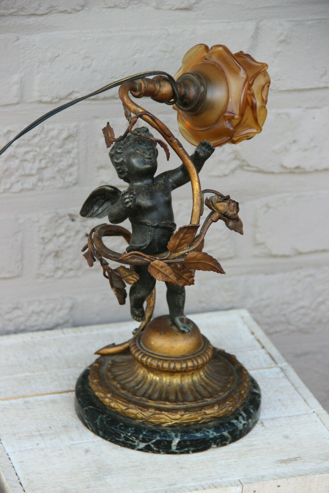 Antique French spelter marble base amber tulip shade angel putti lamp