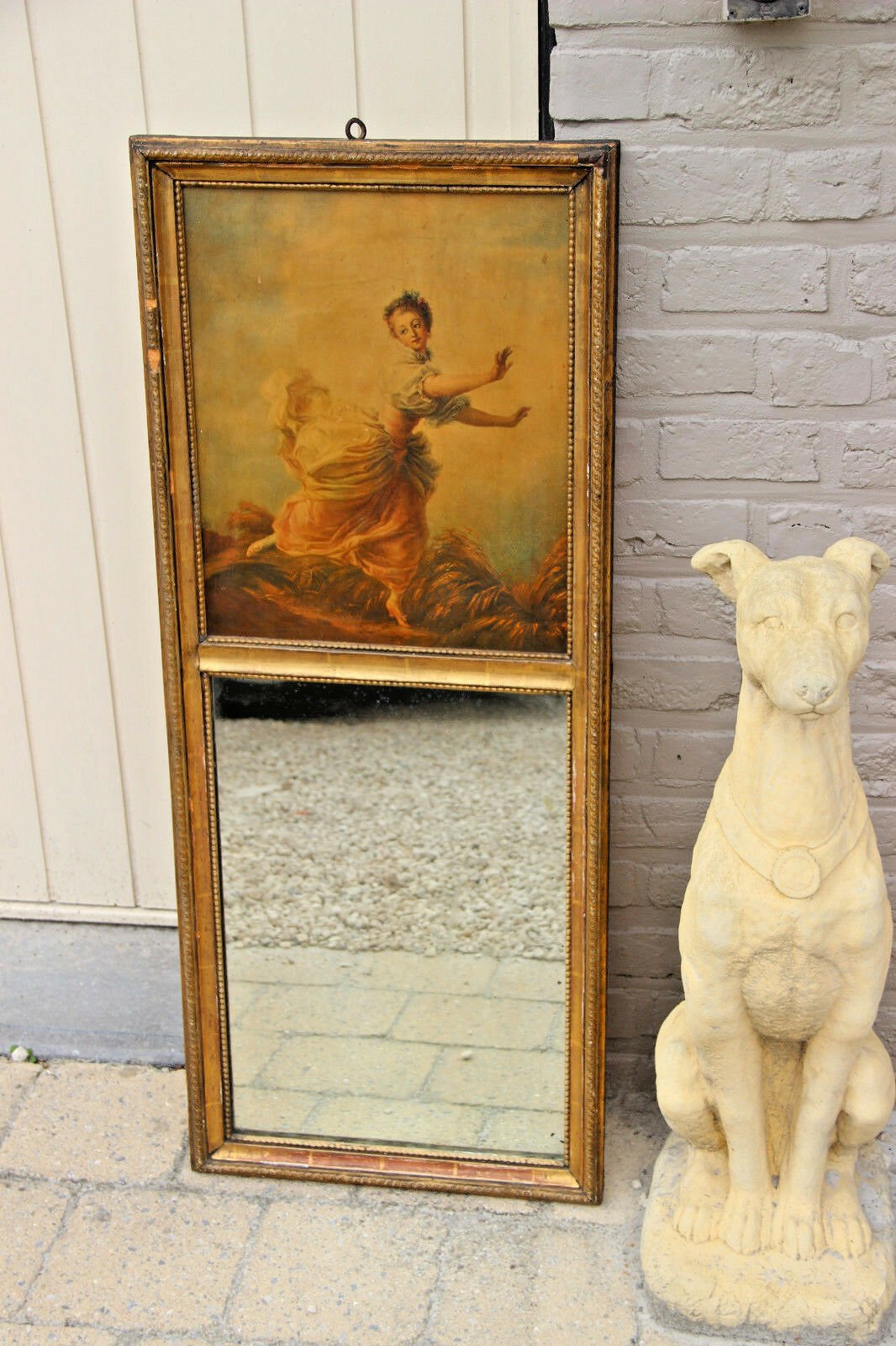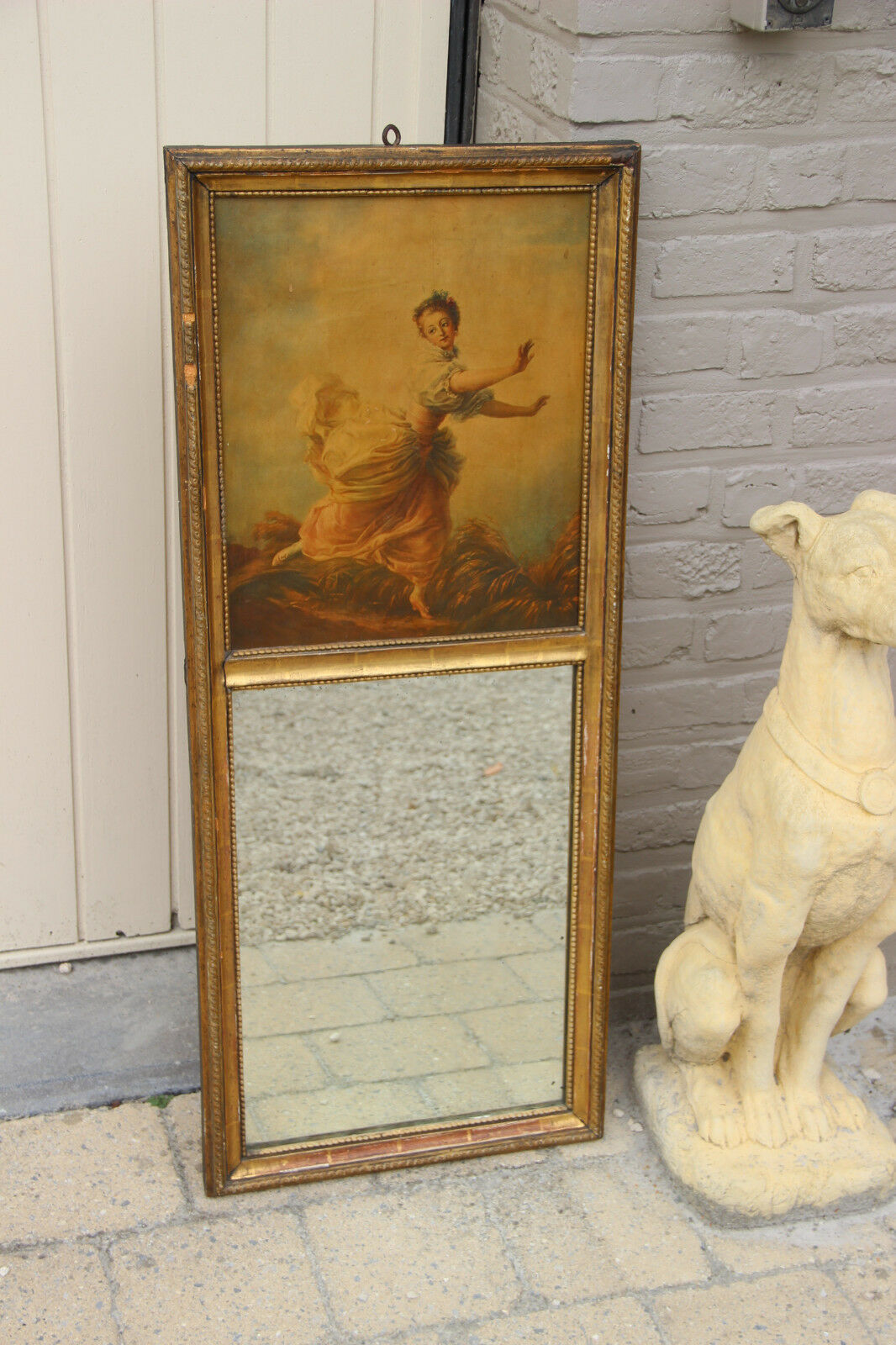 Antique French Trumeau mirror wood stucco litho victorian lady after Boucher