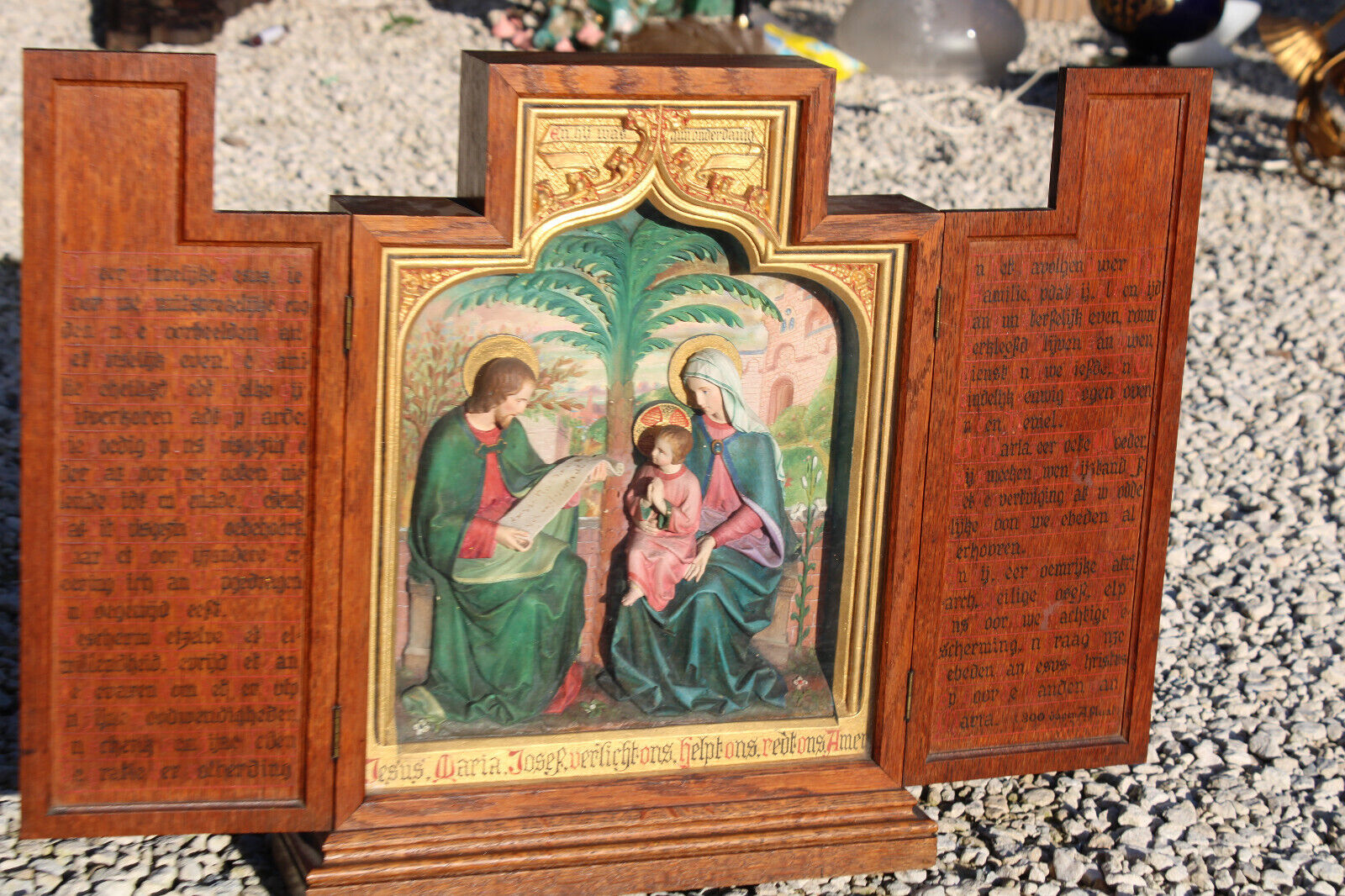 antique neo gothic triptych relief terracotta holy family bible text wood frame
