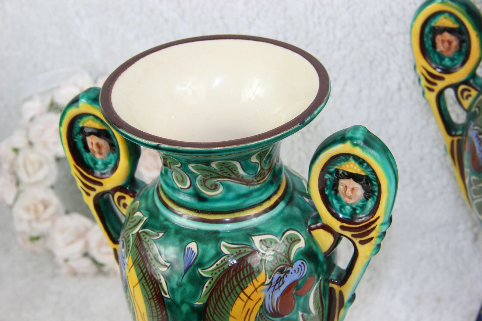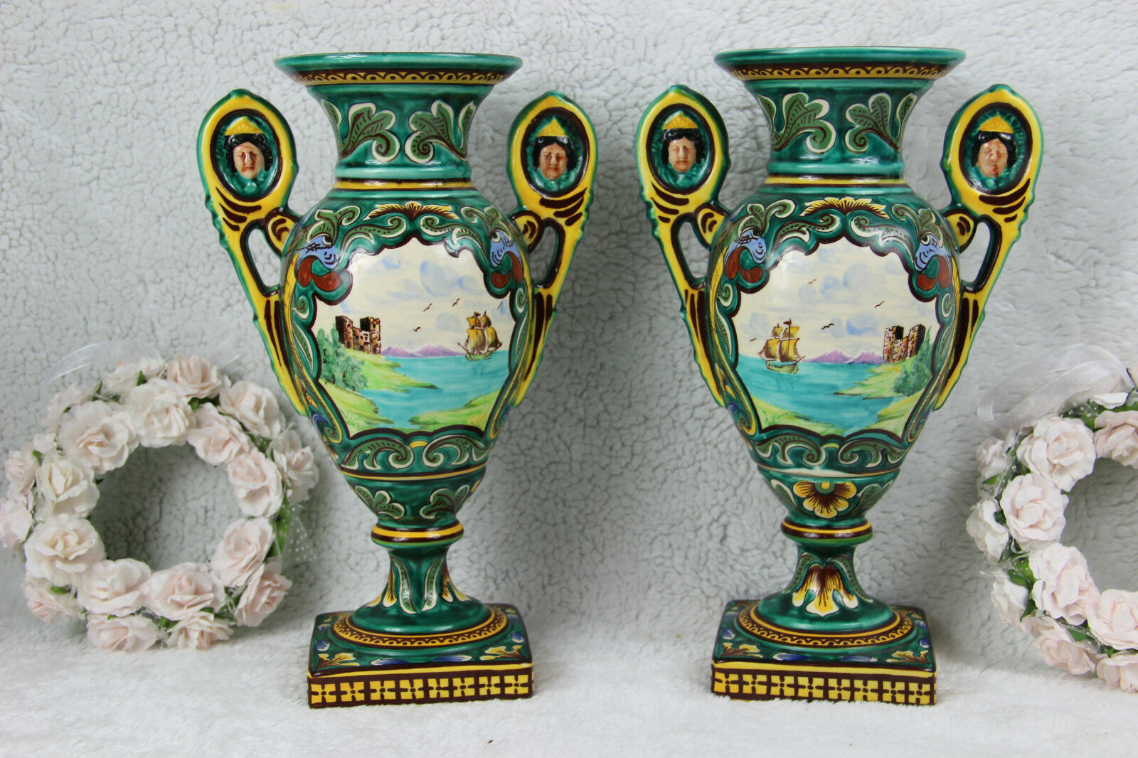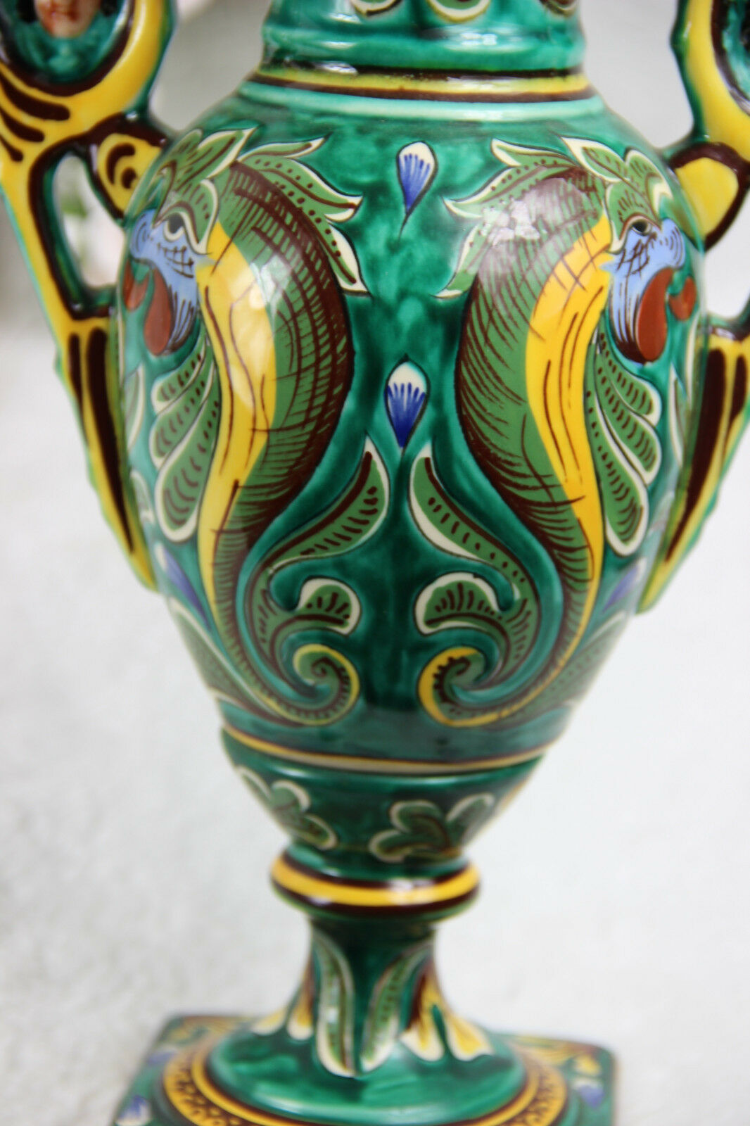 Antique pair French Barbotine majolica queen elizabeth mythological dragon vases