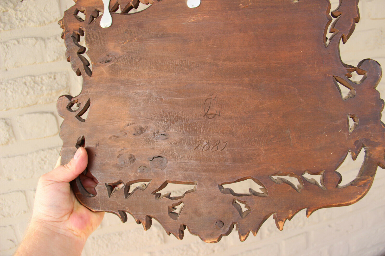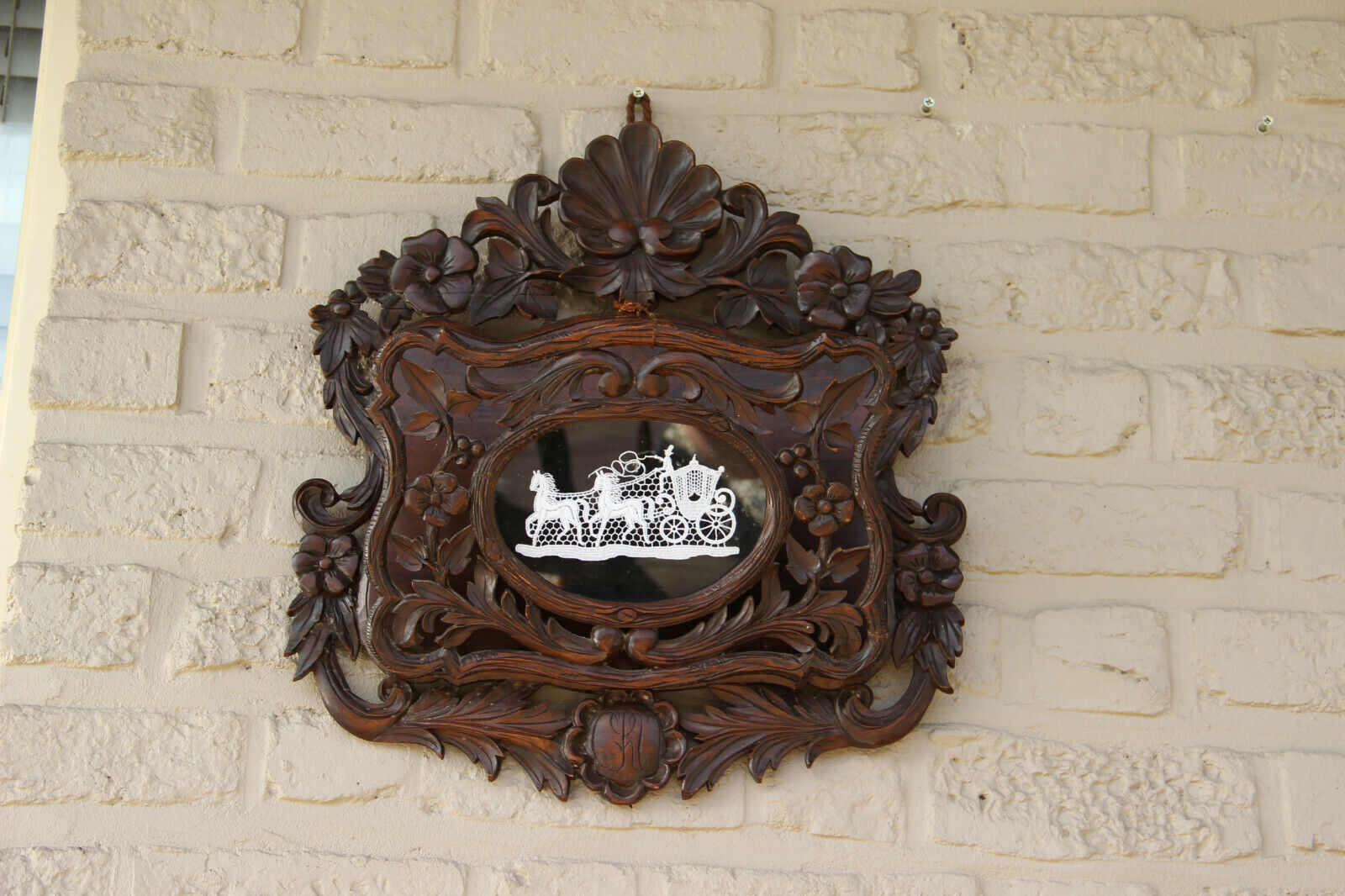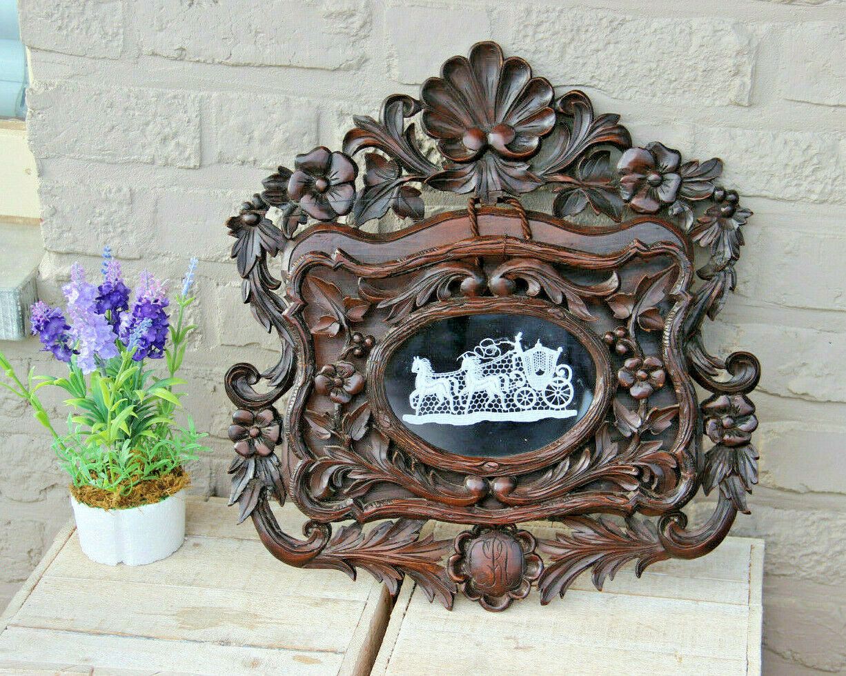 Antique XL Black Forest Wood carved letter holder Bruges LAce carriage 1881