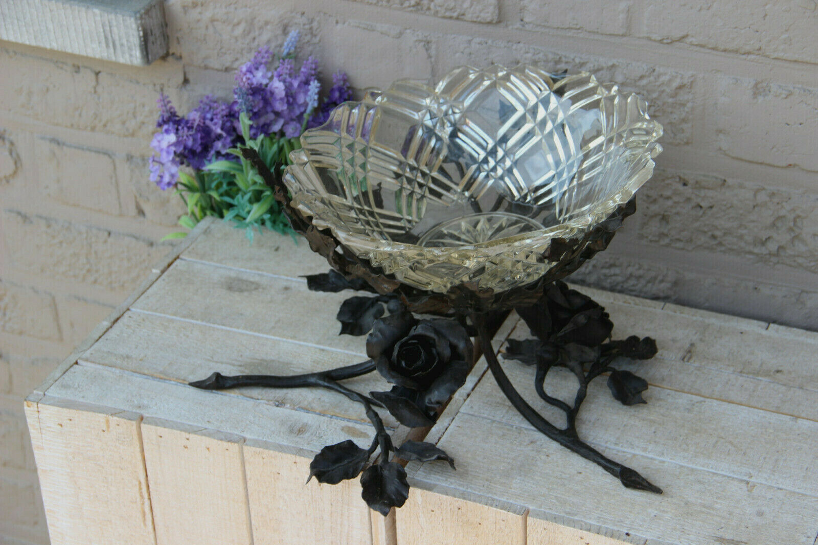French wrought iron roses floral Centerpiece Fruit tray crystal glass cut bowl