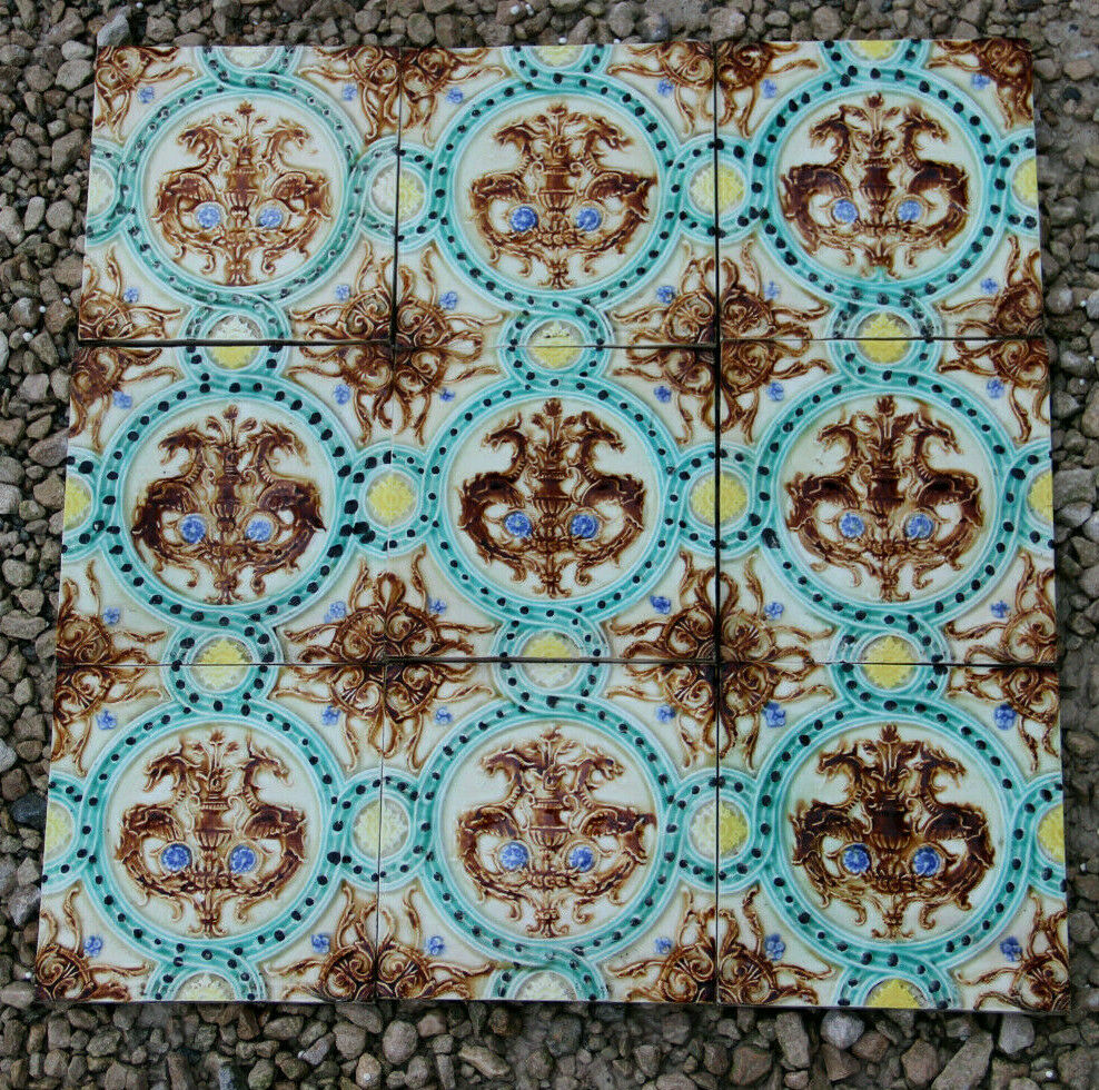 Gorgeous Antique French barbotine majolica set 9 tiles dragon gothic decor