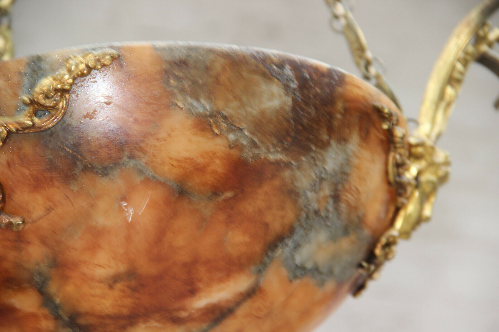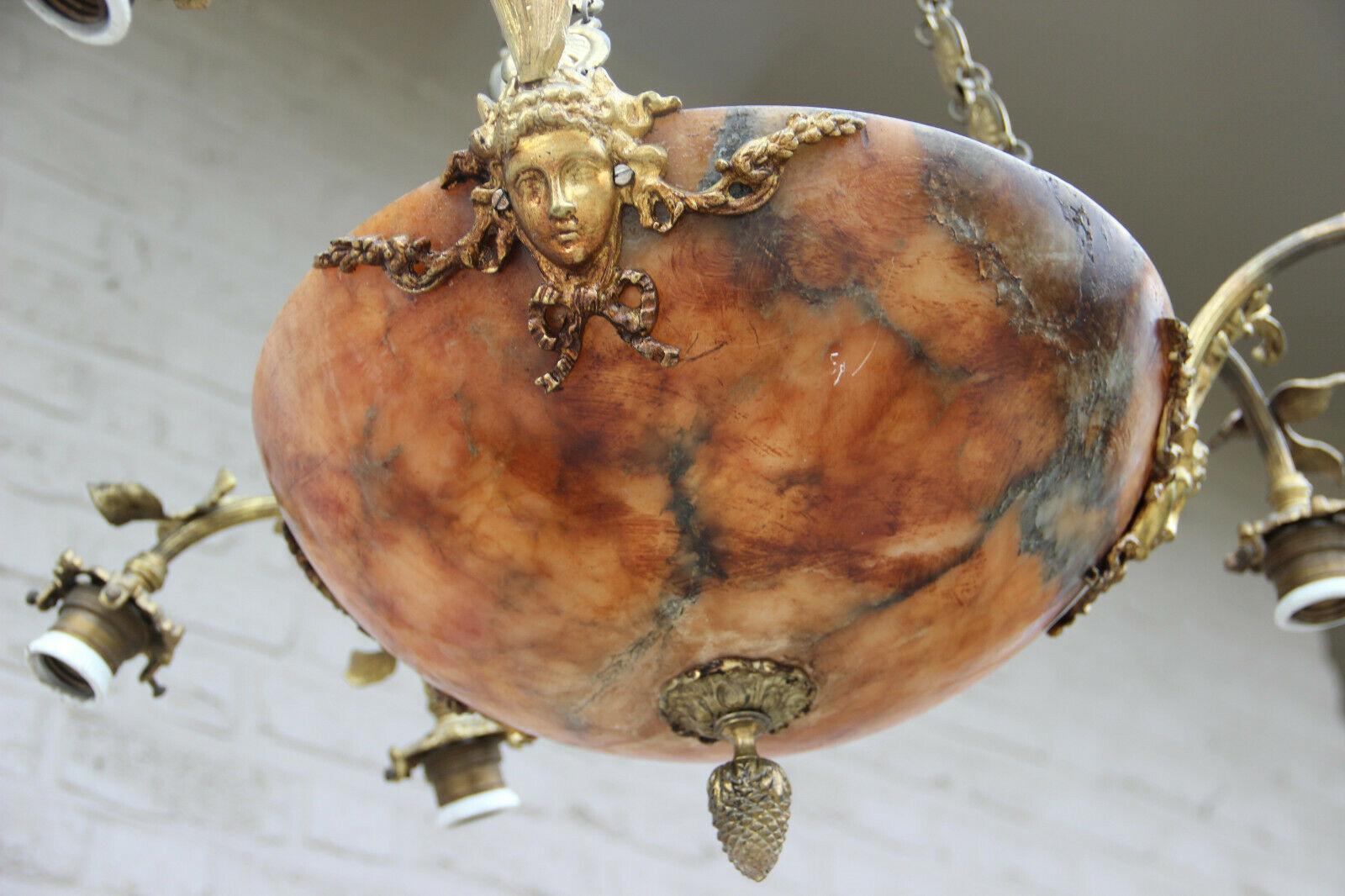 Gorgeous French amber alabaster bowl coupe caryatid heads chandelier lamp