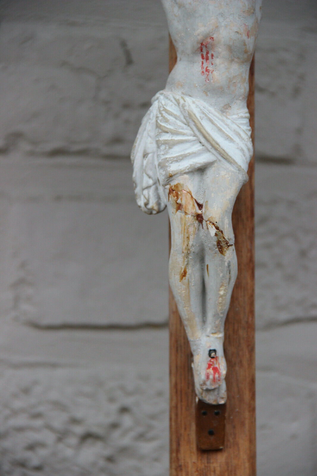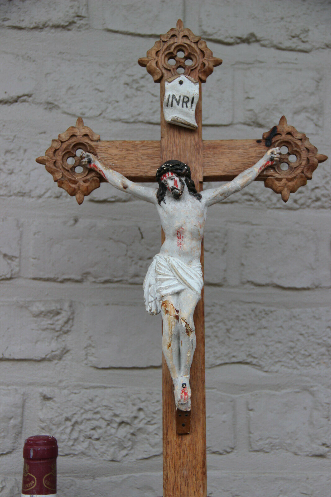 LARGE antique neo gothic wood carved crucifix chalkware christ religious