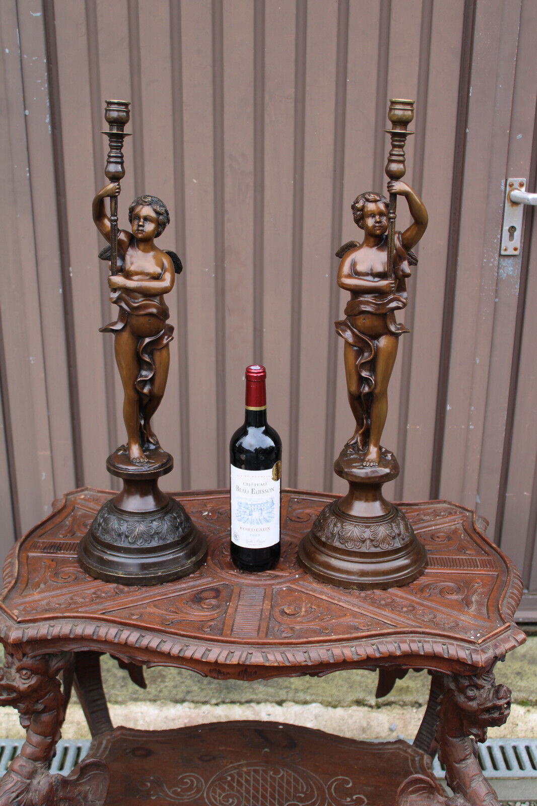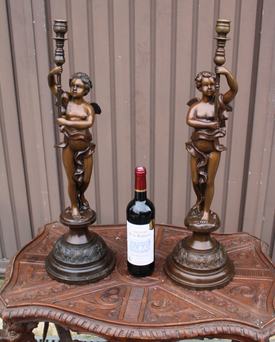 PAIR 1950 Bronze putti cherub candlesticks candle holder statue