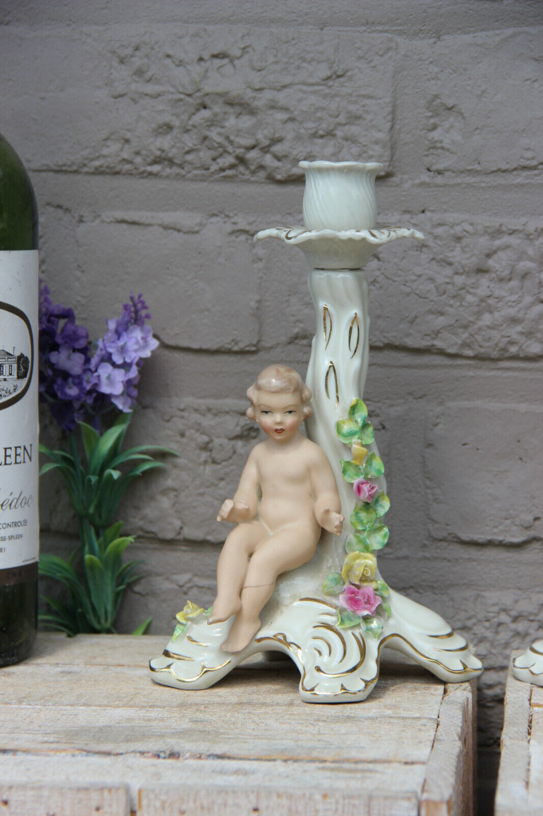 PAIR vintage Dresden porcelain marked candle holders putti figurine