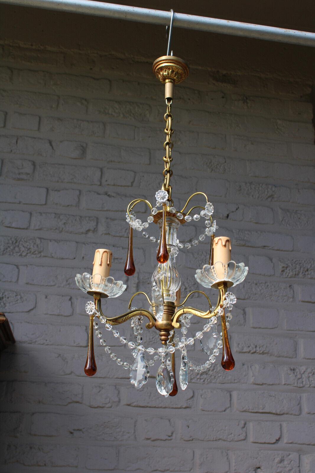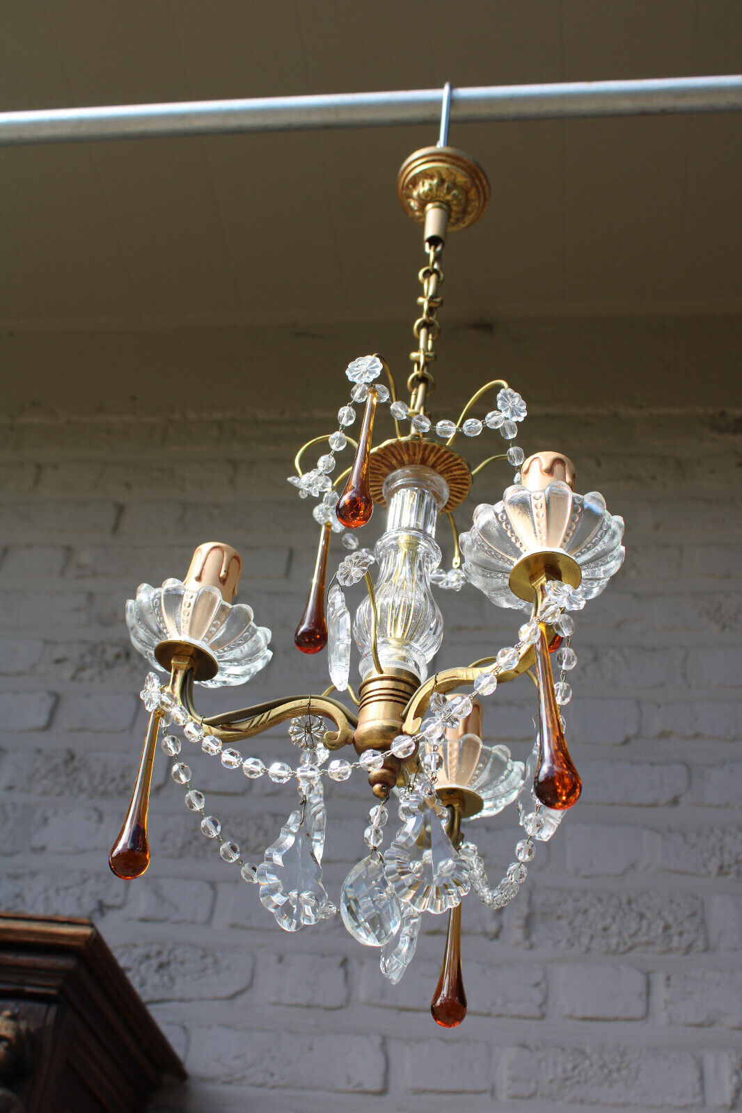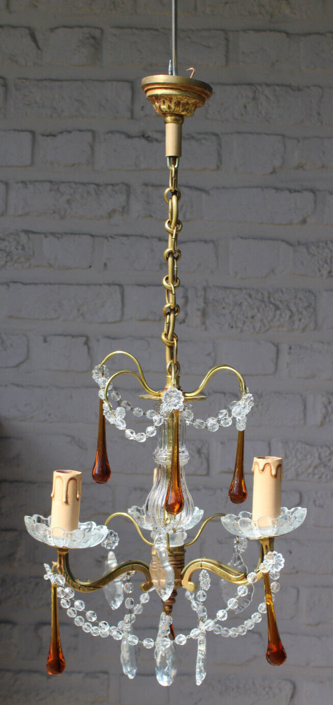 Vintage 1970 French crystal murano glass drops clear amber chandelier lamp